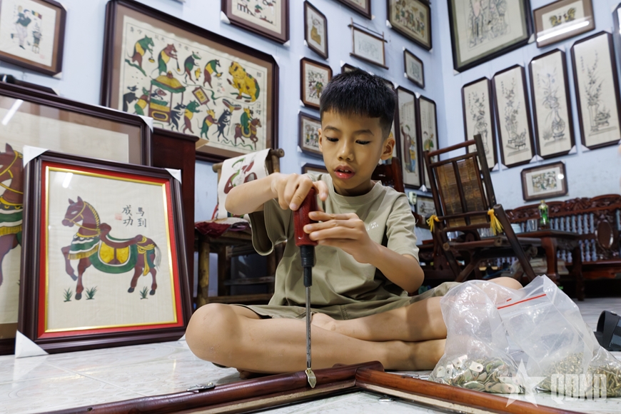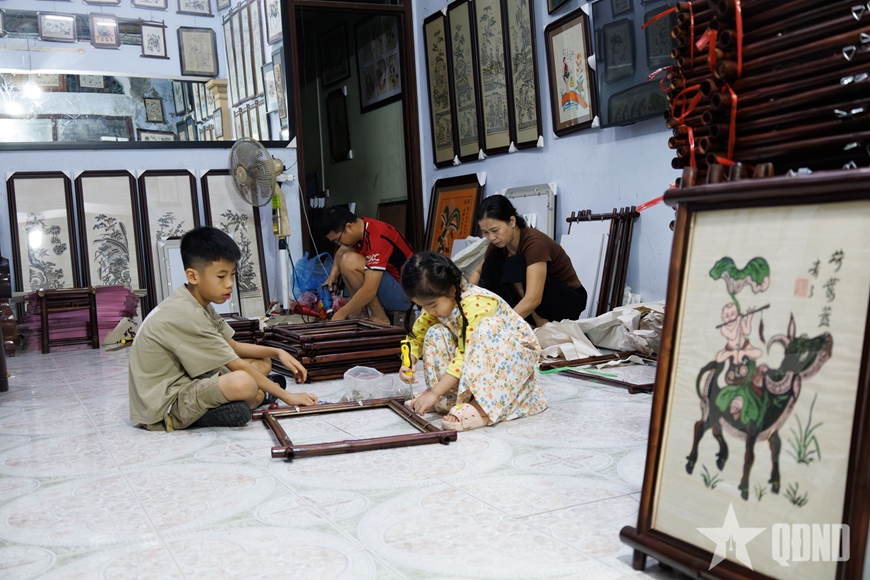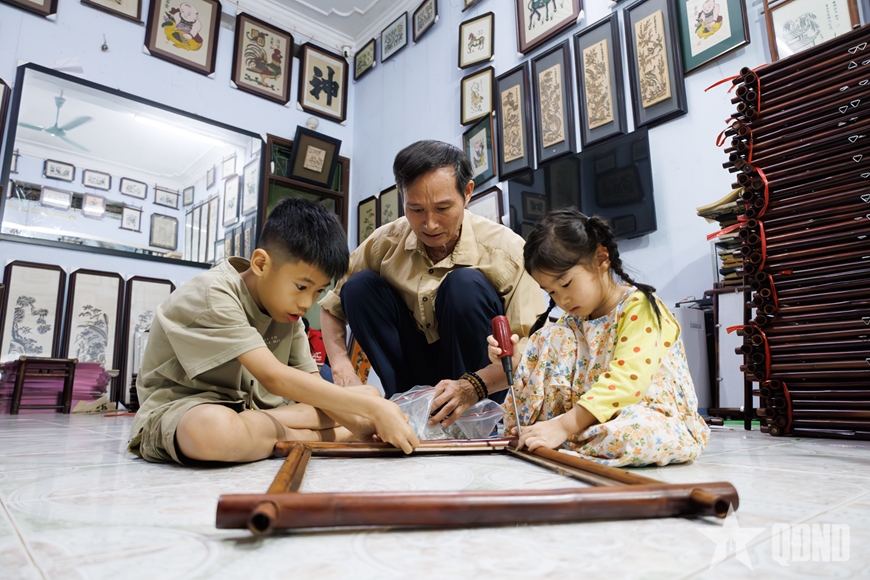 Ông Quả luôn dành thời gian truyền nghề cho các cháu của mình, nhỏ nhất cũng chỉ mới gần 4 tuổi. “Các cháu nhỏ thì tôi dạy từ các công đoạn dễ nhất như đóng khung hay làm quen với mùi hồ nếp, các màu cơ bản của tranh. Với ông, việc để cháu làm quen với những việc này là cách tự nhiên nhất để truyền tình yêu văn hóa dân tộc vào tâm hồn thế hệ măng non”, ông Quả nói.