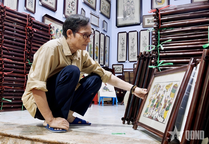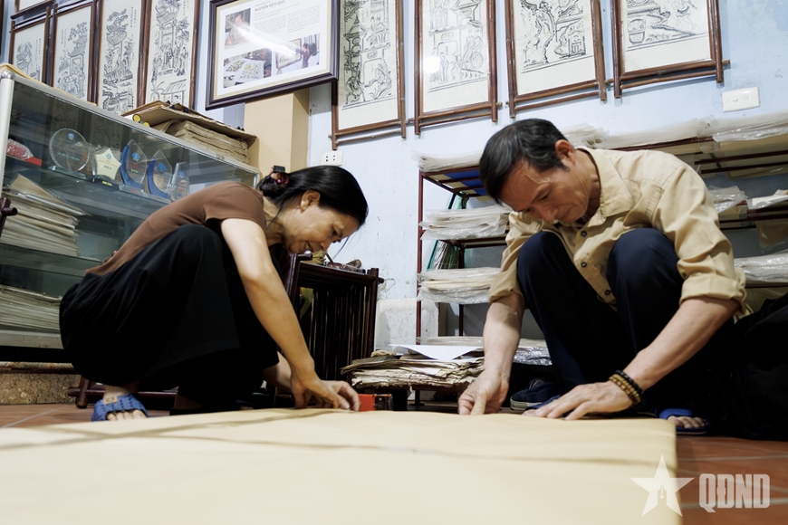 Phía sau mỗi bức tranh kỳ công là sự tần tảo của người vợ, người cùng ông tỉ mỉ đóng gói từng xấp tranh để giao đi khắp mọi miền. Sự đồng hành bền bỉ của người bạn đời chính là điểm tựa vững chắc nhất để ông Quả yên tâm gìn giữ tổ nghiệp suốt hơn 60 năm qua.