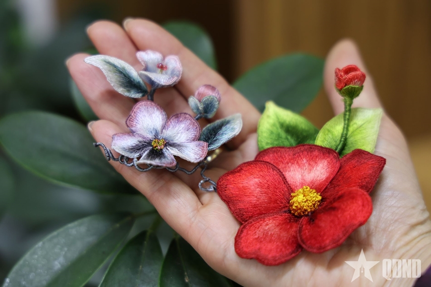 | Những bông hoa chỉ "nở" trên bàn tay thêu của nghệ nhân Hữu Hạnh. |