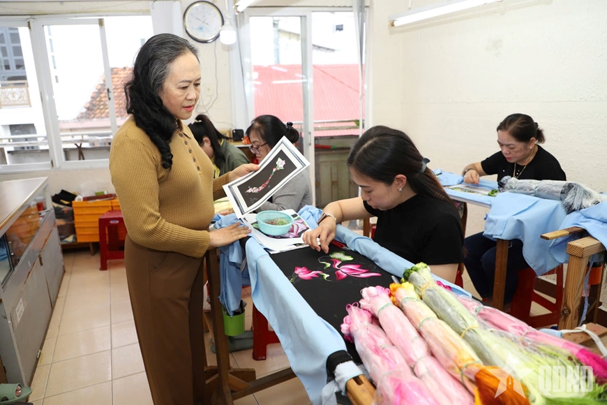 | Nghệ nhân Hữu Hạnh truyền nghề thêu cho các em học viên. |
