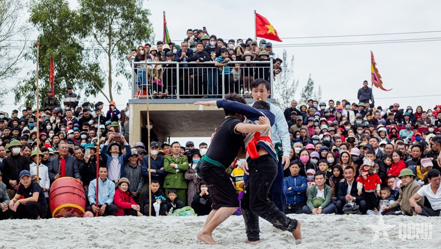 | Sới vật trong lễ hội khai hạ làng Tượng Sơn thu hút đông đảo người dân địa phương tham gia. |