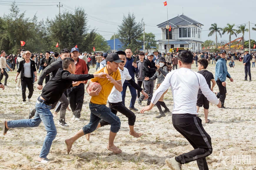 Hội cướp cù diễn ra trên bãi cát rộng giữa làng. Sân cù dài khoảng 200m, rộng 150m, hai đầu dựng cột tre cao treo rọ làm mục tiêu. Khi trọng tài tung quả cù, trận đấu bắt đầu trong tiếng trống, tiếng chiêng và sự cổ vũ cuồng nhiệt của hàng nghìn người xem.