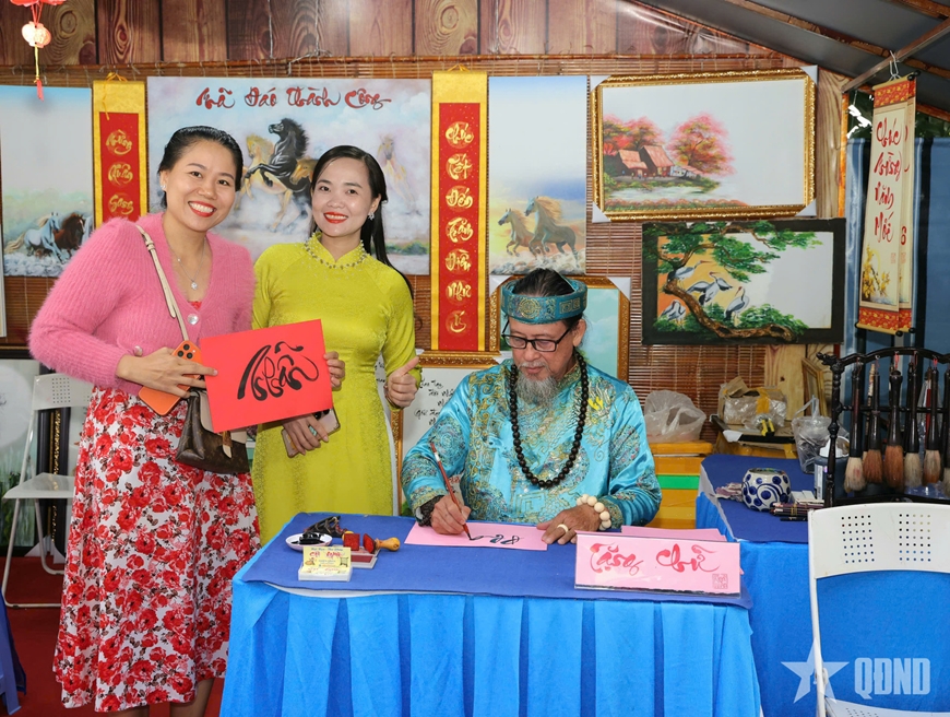 Dưới những gian lều được bài trí trang nhã, các nghệ nhân thư pháp chăm chú đưa từng nét bút mềm mại trên nền giấy đỏ. Mỗi con chữ hiện lên không chỉ mang giá trị nghệ thuật, mà còn gửi gắm những mong ước tốt đẹp cho một năm an lành, thuận lợi.