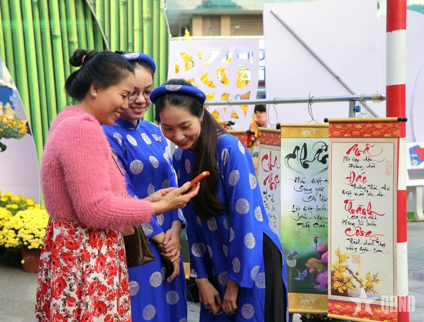 Không chỉ là nơi xin chữ, “Phố ông đồ” còn là điểm đến được nhiều người lựa chọn để chụp ảnh kỷ niệm trong ngày đầu năm. Những tà áo dài truyền thống nổi bật giữa nền đỏ của câu đối, giấy xuân, tạo nên khung cảnh vừa cổ kính vừa gần gũi. Dòng người nối nhau xếp hàng trật tự, ai cũng mong được nhận một con chữ mang theo niềm tin và hy vọng cho năm mới.