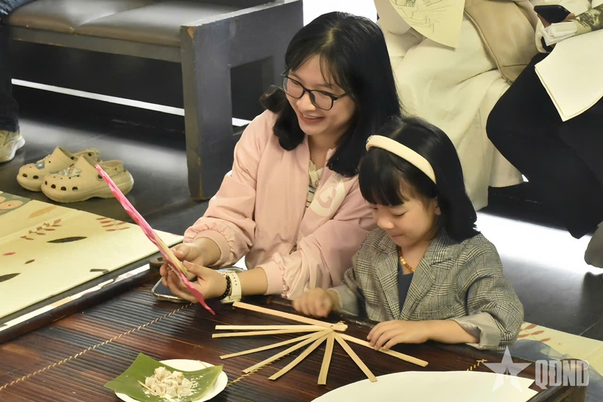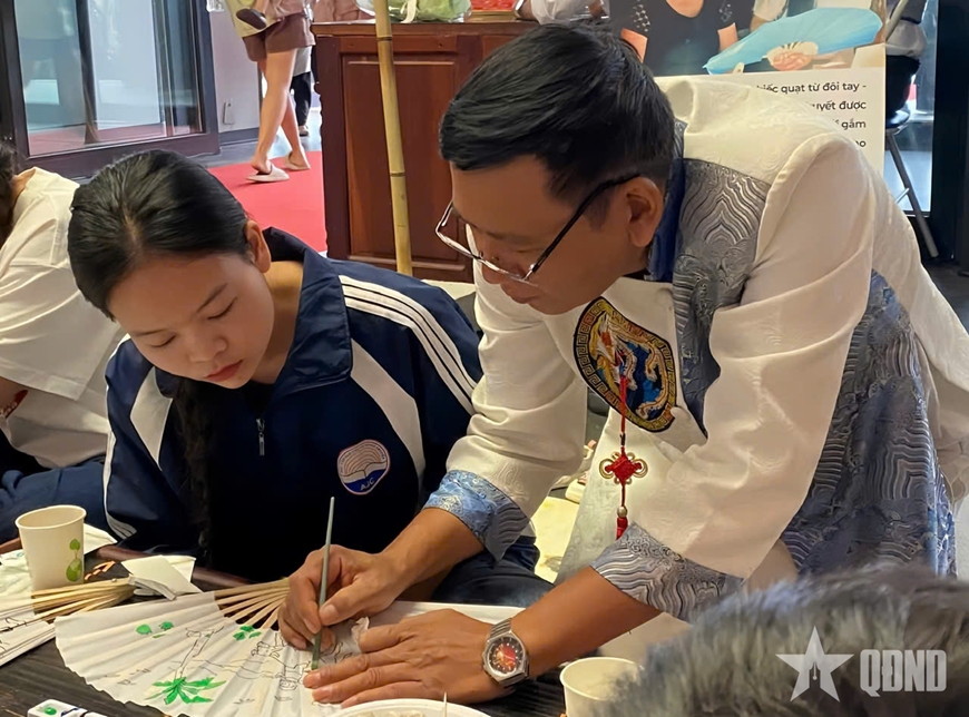 Nghệ nhân Dương Văn Đoàn hướng dẫn các bạn trẻ trải nghiệm làm quạt Chàng Sơn.