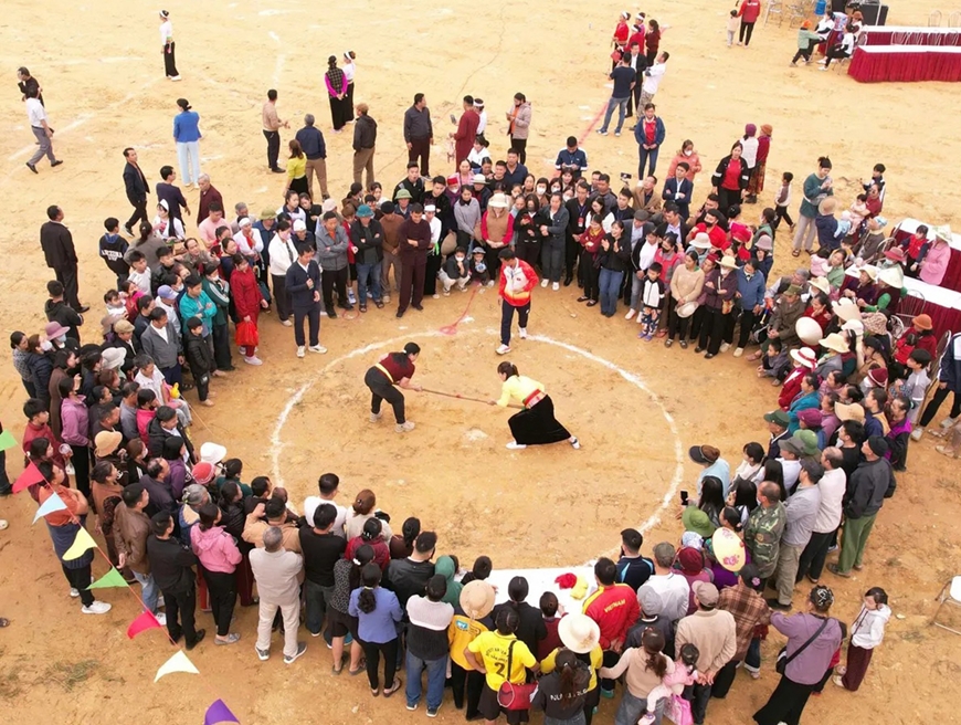 | Đông đảo nhân dân và du khách xem thi đấu môn đẩy gậy tại Ngày hội văn hóa dân tộc Mường xã Yên Xuân, TP Hà Nội lần thứ I năm 2026. Ảnh: CÔNG PHƯƠNG |