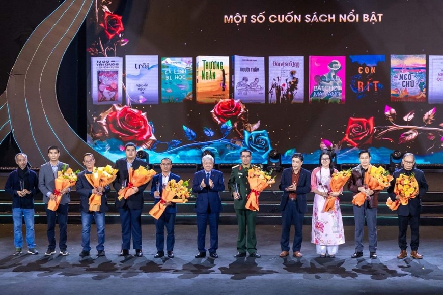 Nhà văn Lê Quang Trạng (đứng thứ năm, từ trái sang) được vinh danh là tác giả sách nổi bật năm 2023. Ảnh: TRẦN HUẤN |