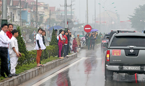 | Người dân thành phố Hà Tĩnh đứng trong mưa cổ vũ cho các vận động viên. |