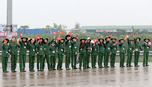 | Sinh viên Đại học Vinh chào mừng đoàn đua đi qua thành phố Vinh. |