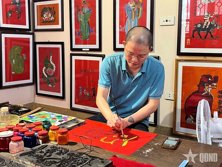 Năm 2014, trong một lần gặp nhà nghiên cứu Nguyễn Thị Thu Hòa, ông Chung được khơi gợi cảm hứng phục dựng dòng tranh thất truyền. Họ bắt đầu hành trình đầy gian nan: Tìm lại bản khắc cổ, phục chế màu, và đặc biệt là tái tạo giấy đỏ - linh hồn của tranh Kim Hoàng. “Chúng tôi phải thử hàng trăm lần nhuộm và phơi để ra được sắc đỏ chuẩn như xưa. Màu đỏ này không phải chỉ để đẹp, nó là màu của may mắn, của niềm tin và sự sống” - nghệ nhân nhớ lại.