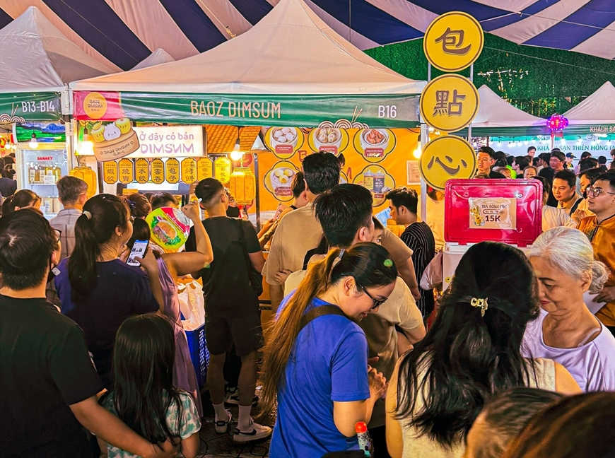 Ngay từ đầu lối vào, dòng người nườm nượp nối dài giữa các dãy gian hàng được sắp xếp như một “con phố ẩm thực thu nhỏ”. Mỗi gian hàng mang một sắc thái riêng: Tiếng xèo xèo với những món ăn vàng rụm tại gian hàng bán đồ chiên; hơi nóng nghi ngút mỗi lần nắp xửng được mở ra tại gian hàng dimsum, bánh bao; gian hàng bán đồ nướng tí tách tiếng than hồng. Bên cạnh đó là những gian hàng nước giải khát, trà sữa rộn rã tiếng máy lắc, tiếng gọi món liên hồi. Tất cả tạo nên không khí lễ hội hấp dẫn thực khách.