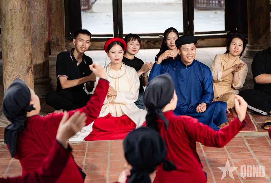 | Diễn viên Phương Nam hóa thân vào vai trong MV trải nghiệm cùng các nghệ nhân trình diễn di sản hát Xoan. |