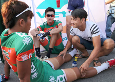 | Anh Lê Văn Phúc chăm sóc cho vận động viên trước khi bước vào chặng đấu mới. |