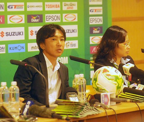 HLV Miura trả lời họp báo sau trận đấu.