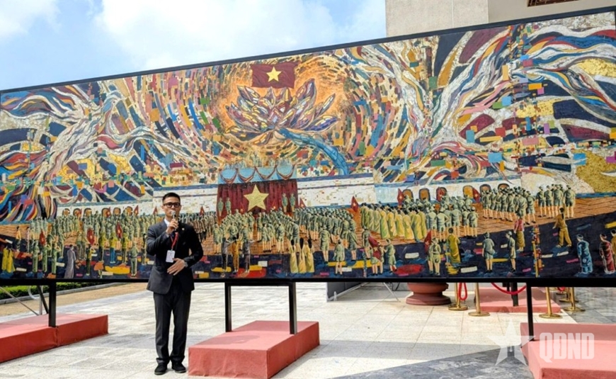 Họa sĩ Chu Nhật Quang bên bức tranh sơn mài “Bác Hồ đọc Tuyên ngôn độc lập” đạt Kỷ lục Guinness thế giới.