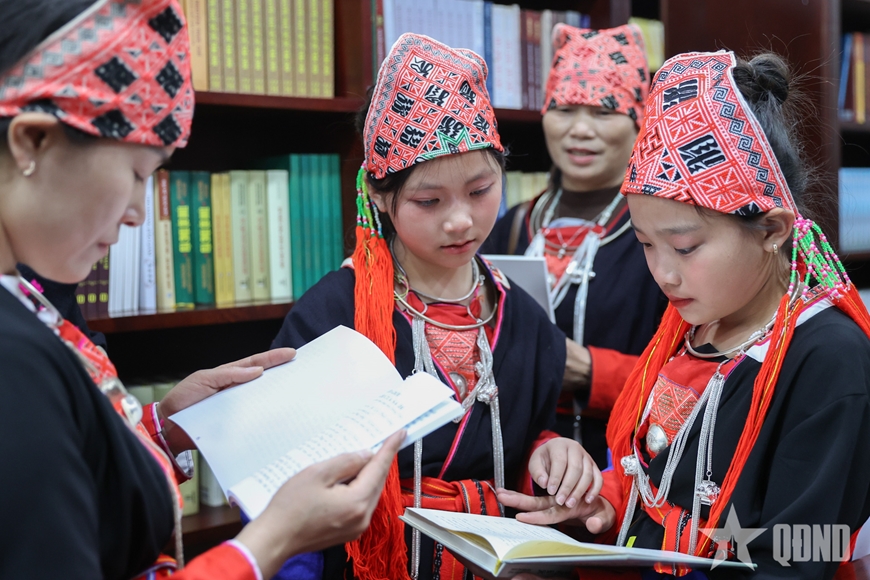 | Học sinh Trường Phổ thông dân tộc nội trú tỉnh Sơn La háo hức đón nhận những cuốn sách. |