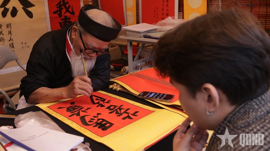 Tại gian lều của nhà thư pháp Nguyễn Văn Tư, thành viên Câu lạc bộ Thư pháp Xuân Hồng, tấp nập người ghé đến xin chữ. Ông đã có 10 năm gắn bó với Hội chữ Xuân.