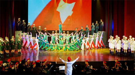 | Tiết mục ca múa "Dưới cờ quyết thắng" do Đoàn ca múa nhạc Quân đội trình diễn tại Lễ Khai mạc. Ảnh Trung Trực. |