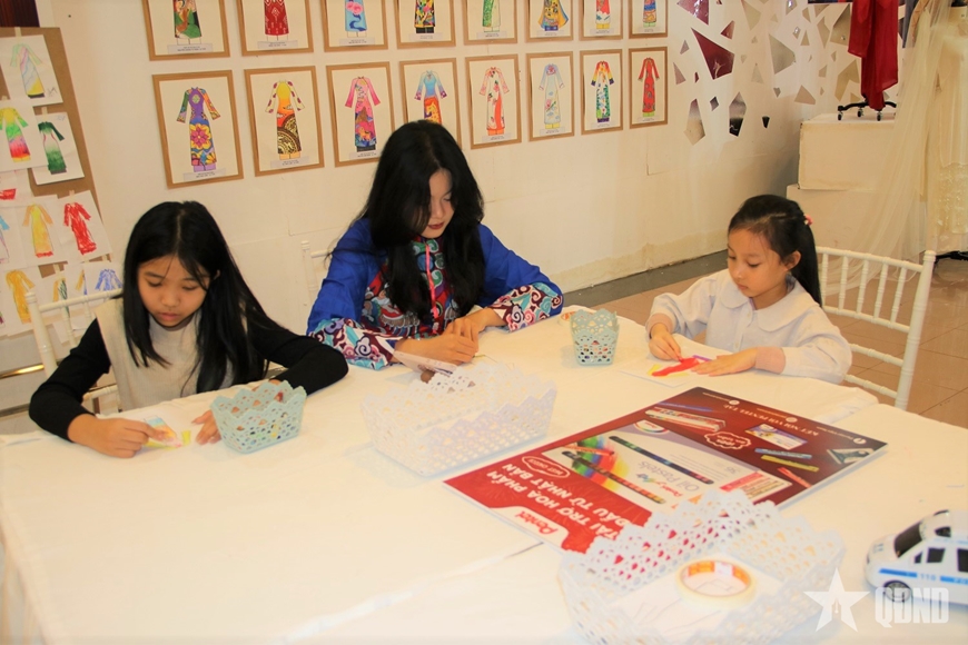 Ở khu vực tranh thiếu nhi “Em vẽ mùa xuân”, những nét vẽ hồn nhiên, rực rỡ sắc màu được tạo nên từ chính trải nghiệm của các em nhỏ với Tết. Trong khi đó, không gian thiết kế thời trang “Du xuân”, hay sắp đặt ảnh nghệ thuật “Nàng thơ xuân” với áo dài truyền thống mang đến những góc nhìn mới mẻ.
