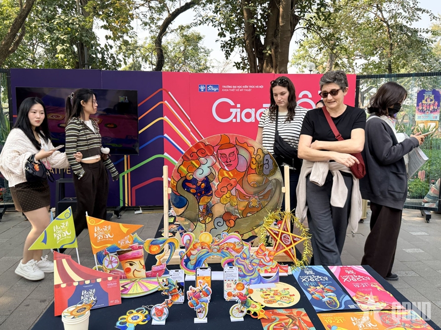 | Công chúng tham quan khu vực trưng bày các sản phẩm sáng tạo của Khoa Thiết kế mỹ thuật, Trường Đại học Kiến trúc Hà Nội. |