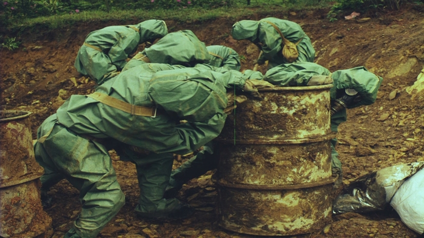 | Hình ảnh các chiến sĩ Binh chủng Hóa học thu gom và xử lý chất độc da cam/dioxin trong phim “Nỗi đau da cam”. Ảnh: Điện ảnh Quân đội. |