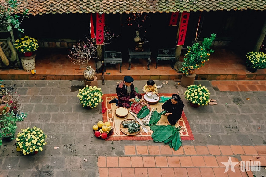 Gạo nếp ngâm nước trắng ngần. Đỗ xanh đãi vỏ vàng óng. Thịt ba chỉ tẩm ướp hạt tiêu thơm nức mũi. Tất cả được bày ra giữa nhà. Bố và ông nội đều là những người nông dân quanh năm chân lấm tay bùn, đến lúc gói bánh lại khéo léo như nghệ nhân, không dùng khuôn gỗ mà bánh vẫn vuông vức, từ xếp lá, đổ gạo, rải đỗ, đặt thịt, rồi lại đỗ, lại gạo. Một tay gấp mép lá, một tay buộc lạt, thao tác nhanh thoăn thoắt. Chiếc bánh xanh mướt, vuông vắn, đẹp như một tác phẩm chứa cả đất trời. Ngoài những chiếc bánh lớn còn có cả những chiếc bánh bé được gói riêng cho trẻ con. Chúng tôi nâng niu như báu vật, còn cẩn thận đánh dấu để luộc xong không bị nhầm.