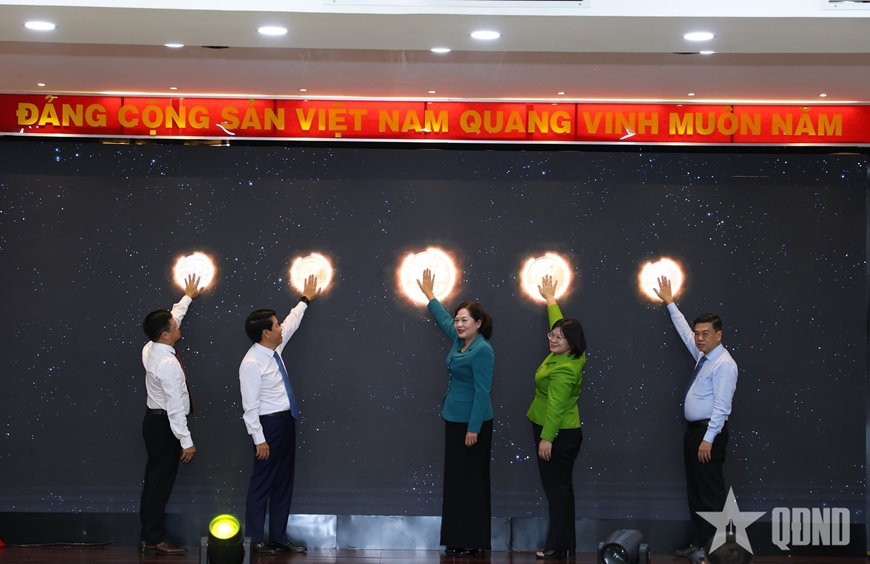 Các đại biểu thực hiện nghi thức ấn nút khai mạc triển lãm.