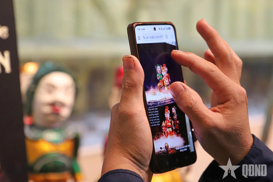 Nhờ đó, công nghệ AR trở thành điểm nhấn nổi bật của triển lãm. Chỉ với một chiếc điện thoại thông minh và thao tác quét mã QR, người xem có thể theo dõi từng tích trò chuyển động ngay trong không gian thực tế. Những hoạt cảnh quen thuộc như múa rồng, đánh cá, chèo thuyền hay chú Tễu tinh nghịch hiện lên sinh động, gợi cảm giác như đang đứng trước một sân khấu thủy đình thu nhỏ.