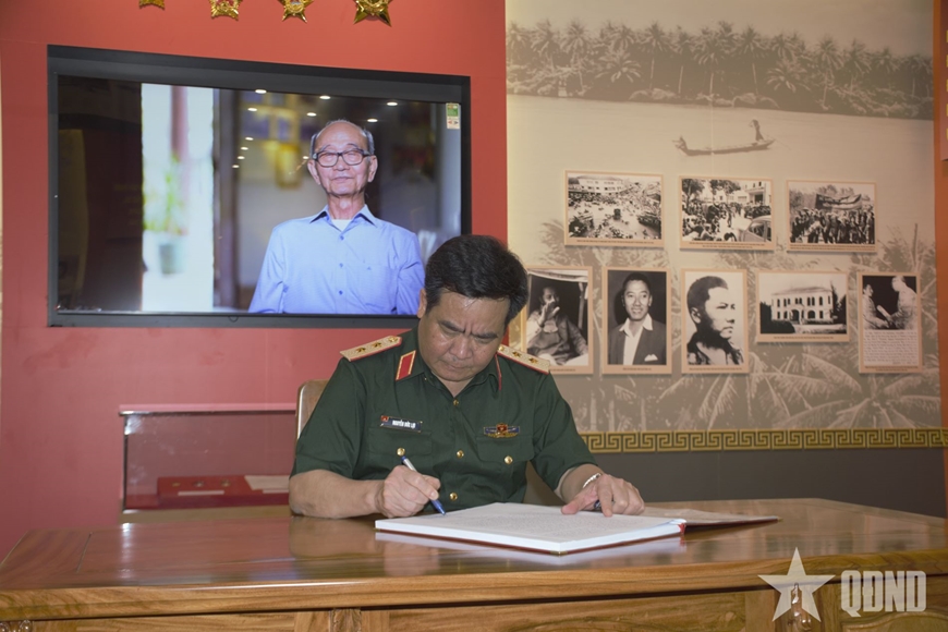 | Trung tướng Nguyễn Đức Lợi, Bí thư Đảng ủy, Chính ủy Tổng cục II viết sổ cảm tưởng tại nhà tưởng niệm. |