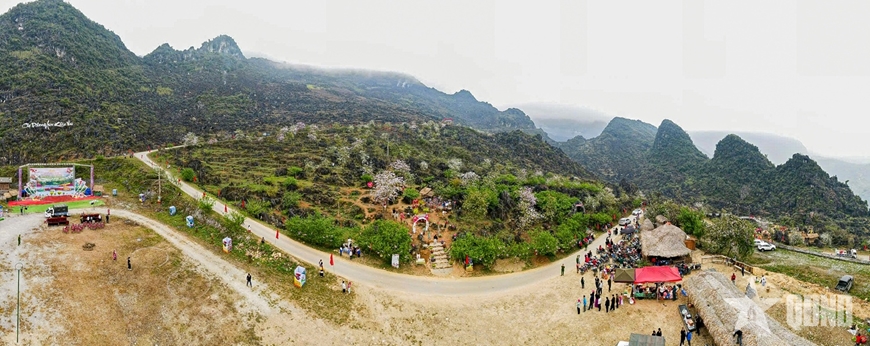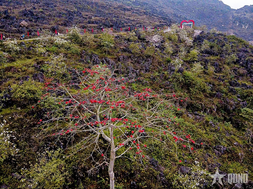 | Từ trên cao nhìn xuống, những cụm hoa ban, hoa mộc miên đan xen giữa đá xám, mở ra một không gian lễ hội gần gũi với thiên nhiên. |