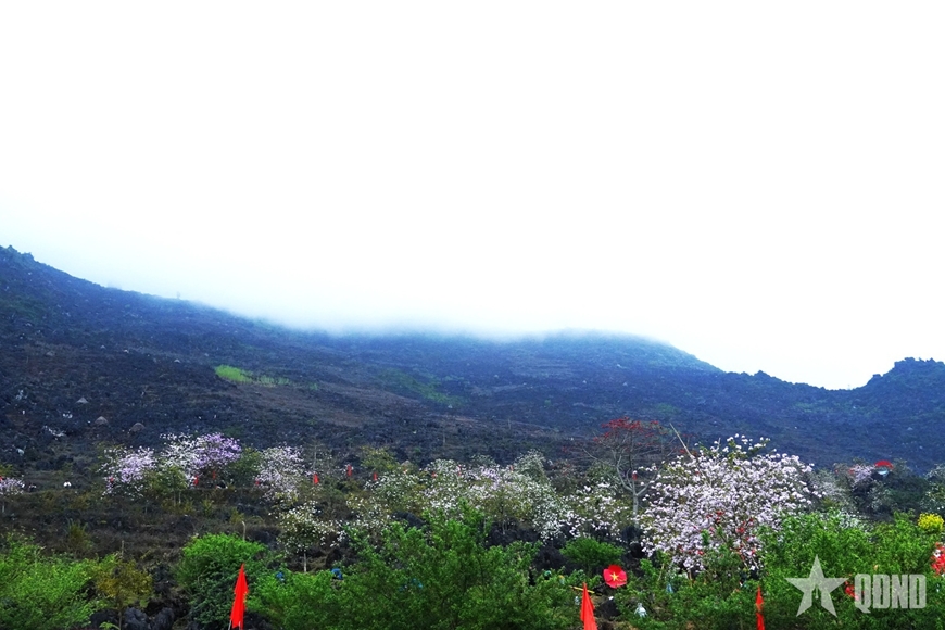 | Giữa mây núi bảng lảng, hoa ban nở trắng trên sườn đá, tạo nên vẻ đẹp vừa hoang sơ, vừa nên thơ cho miền đá Khâu Vai. |