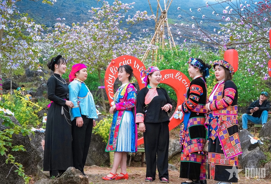 | Những bộ trang phục truyền thống rực rỡ của đồng bào các dân tộc làm nên sắc màu văn hóa đặc trưng của lễ hội hoa mộc miên, hoa ban ở Khâu Vai. |