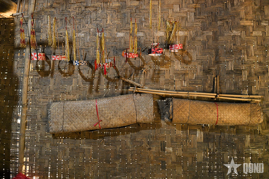 Không gian nhà chia ba phần: Phía Đông cho cha mẹ, phía Tây cho con cái, chính giữa là “phòng khách” tiếp khách quý bằng chiếu trải, rượu cần. Bếp lửa đặt cách xa cầu thang, giữ an toàn. Bà Ngọc chia sẻ thêm: “Còn một nét đẹp độc đáo trong kiến trúc của nhà sàn, đó là “nhà chồ” – gian ló ra trước cửa chính giữa – tạo hình chữ T, không vách, hướng Nam đón gió, nơi phụ nữ giã gạo, gia đình hóng mát. Nhưng tiếc là ở đây vẫn chưa tái hiện được hết”. Cầu thang chính diện dẫn qua nhà chồ vào gian giữa, tiện lợi mà riêng tư. Nhà sàn thường có 6 gian, tăng giảm tùy số người, thành “nhà dài” nếu đông đúc.