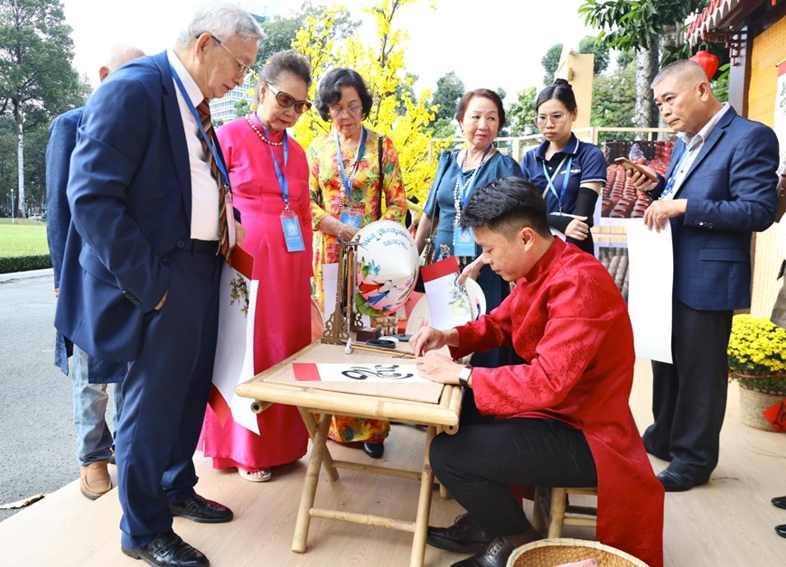 | Kiều bào trải nghiệm hoạt động xin chữ tại Triển lãm không gian Tết cổ truyền. |