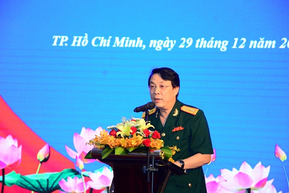 Đại tá Nguyễn Xuân Thủy, Hiệu trưởng Trường Đại học VHNT Quân đội phát biểu tại buổi lễ. |