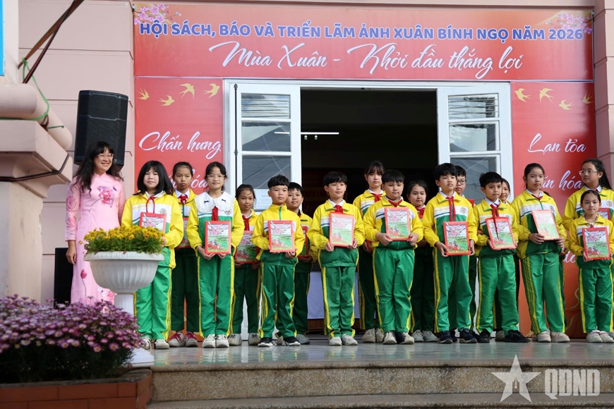| "Mừng tuổi sách" tặng các em học sinh lại chương trình. |