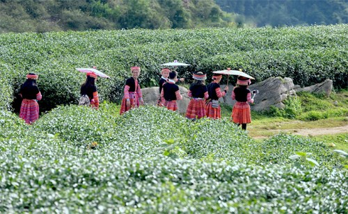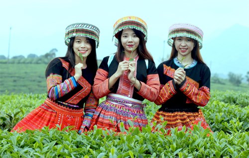 Sinh viên Thủ đô hào hứng trong trang phục truyền thống của đồng bào Mông bên những luống chè xanh mướt.