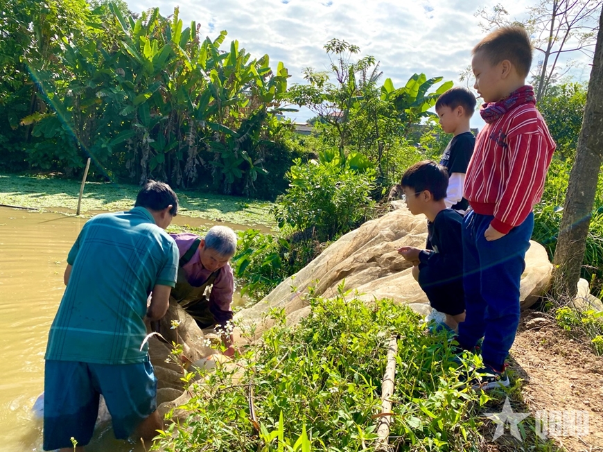 | Các cháu háo hức xem ông kéo cá. Ảnh: DƯƠNG THU |
