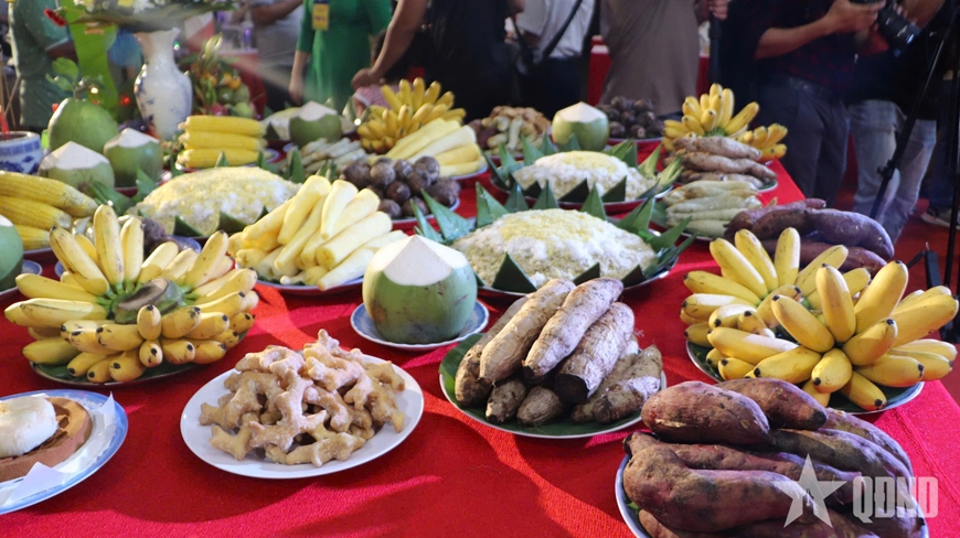 | Mâm lễ được bày biện trang trọng gồm những sản vật từ mùa gặt. |