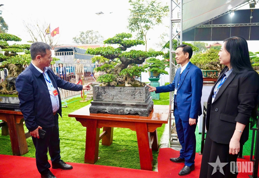 Các đại biểu và du khách tham quan những tác phẩm bonsai đặc sắc được mang tới từ nhiều tỉnh, thành phố phía Bắc trưng bày tại triển lãm.