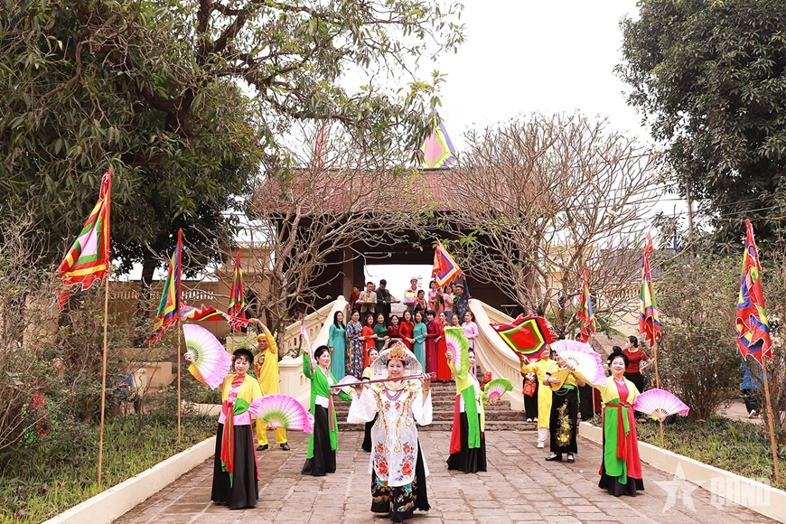 Từ sáng sớm, không gian đình làng cổ kính như được đánh thức bởi tiếng trống chiêng, cờ hội rợp lối, dòng người nô nức về dâng hương tưởng nhớ các bậc tiền nhân.