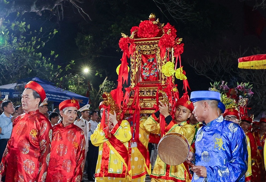 | Nghi thức rước kiệu ấn về đền Thiên Trường. Ảnh: VIẾT DƯ |