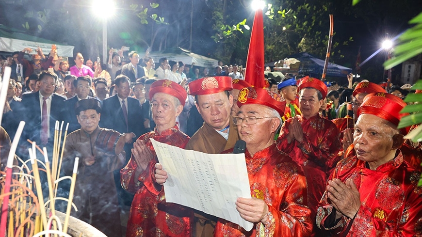 Nghi thức trình Chúc văn trước giờ khai ấn. Ảnh: VIẾT DƯ