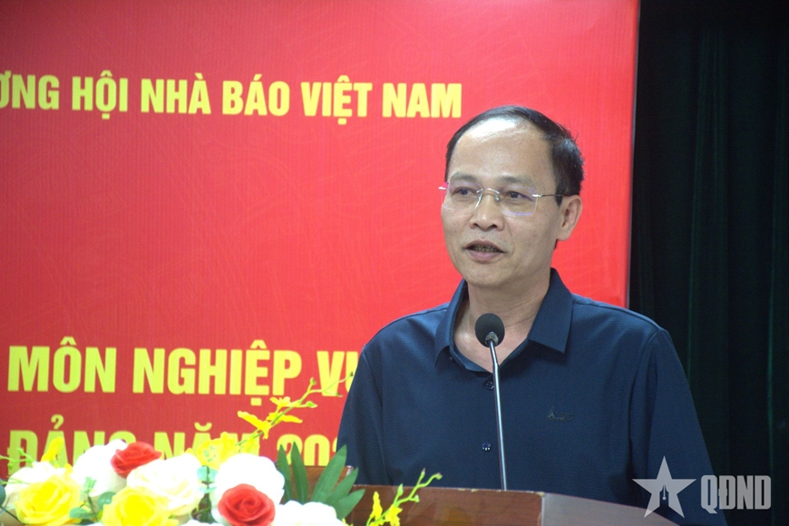 | Đại tá Lê Ngọc Long, Phó tổng biên tập Báo Quân đội nhân dân, Chủ tịch Liên chi hội Nhà báo Báo Quân đội nhân dân trình bày tham luận. |
