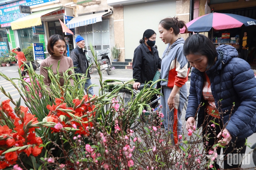 | Khách tìm mua cành đào trang trí bàn thờ Tết. |