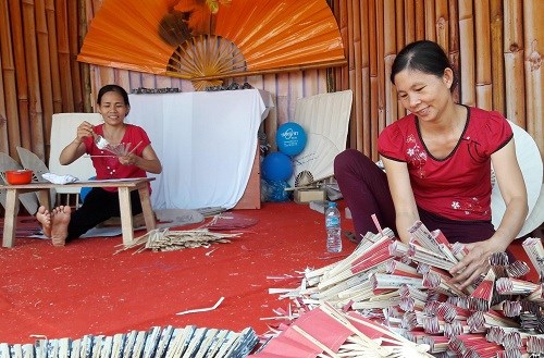 Đến thăm nhà chị Nguyễn Thị Thuận ở xóm Đình, thôn 5, được chứng kiến những công đoạn làm quạt mới thấy hết sự công phu tỉ mỉ của người thợ. Đã gắn bó với nghề hơn 30 mươi năm nên chị Thuận rất thuần thục trong tất cả các công đoạn. Chị vừa làm vừa giới thiệu để người xem hiểu được quy trình làm ra một sản phẩm quạt giấy. Công đoạn đòi hỏi sự khéo léo đó chính là phất quạt. Từng nan quạt được xòe ra cố định trên mặt bàn. Người thợ dùng keo sữa phết lên. Ngày trước khi chưa có keo người thợ phải dùng bột sắn hay nhựa quả hồng non. Nay cải tiến người làm sử dụng loại keo dán gỗ giúp quạt được gắn chắc, bền đẹp hơn. Giấy làm quạt truyền thống thường là giấy dó của làng Kẻ Bưởi (Hà Nội) hoặc giấy điệp Đông Hồ (Bắc Ninh), nay sử dụng cả giấy Indo. Khi đặt giấy vào nan quạt phải khéo léo tỉ mỉ sao cho mặt giấy phẳng phiu không bị nhàu, nếp gấp thẳng đẹp.