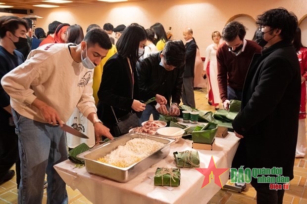 Kiều bào ở Pháp tổ chức gói bánh chưng truyền thống. Ảnh do tác giả cung cấp