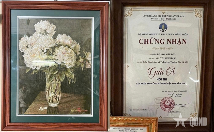 Tôi đặc biệt ấn tượng với bức tranh “Hoa mẫu đơn” mà nghệ nhân Nguyễn Xuân Dục lấy cảm hứng từ sự tần tảo, hy sinh thầm lặng của mẹ ông. Tác phẩm sử dụng gam màu nhạt nhưng không hề đơn điệu, khắc họa rõ từng cánh trong, cánh ngoài của hoa mẫu đơn, qua đó gửi gắm hình ảnh người mẹ tần tảo, trải qua nhiều vất vả, sương gió, lặng lẽ nuôi con ăn học, trưởng thành và làm nghề. Đây là tác phẩm đạt giải A toàn quốc Hội thi sản phẩm thủ công mỹ nghệ Việt Nam năm 2022 do Bộ Nông nghiệp và Phát triển Nông thôn (bây giờ Bộ Nông nghiệp và Môi trường) tổ chức.