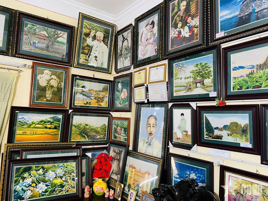 | Tranh thêu tay và bằng khen của nghệ nhân treo kín các bức tường. Ảnh:THÙY DƯƠNG |