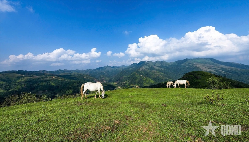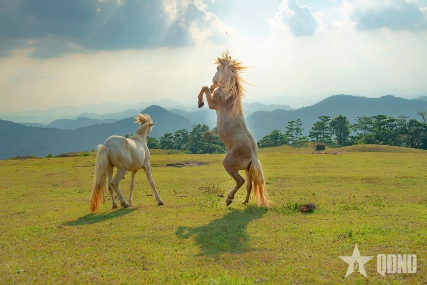 | Ngựa bạch trên thảo nguyên Khau Sao. Ảnh: SƠN TÙNG |